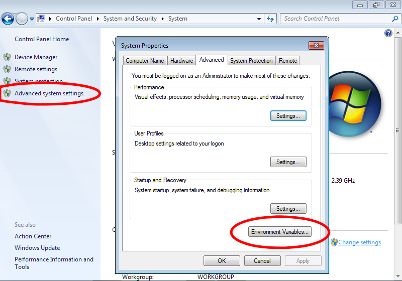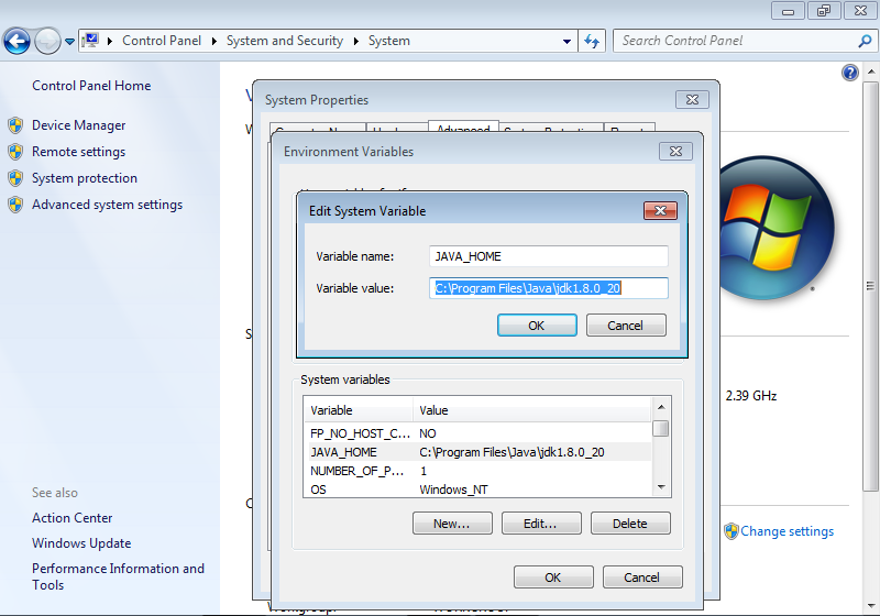 Předpokládejme, že Java je nainstalována v adresáři Program Files/Java, například jako součást balíku Netbeans. A konkrétně například adresáři (složce) C:\Program Files\Java\jdk1.8_20, ve kterém jsou binární soubory javac a java v podadresáři bin. Po instalaci není standardně nastavena cesta k adresáři bin, tj. tento adresář není v seznamu prohledávaných adresářů, ze kterých jsou spouštěný programy. Proto přidáme cestu C:\Program Files\Java\jdk1.8_20\bin do toho seznamu, což je proměnná prostředí Path. Tu najdeme v ovládacích panelech, nastavení systému, pokročilé nastavení, proměnné prostředí. V anglické verzi Windows 7 je postup nastavení ilustrován na následujících obrázcích.