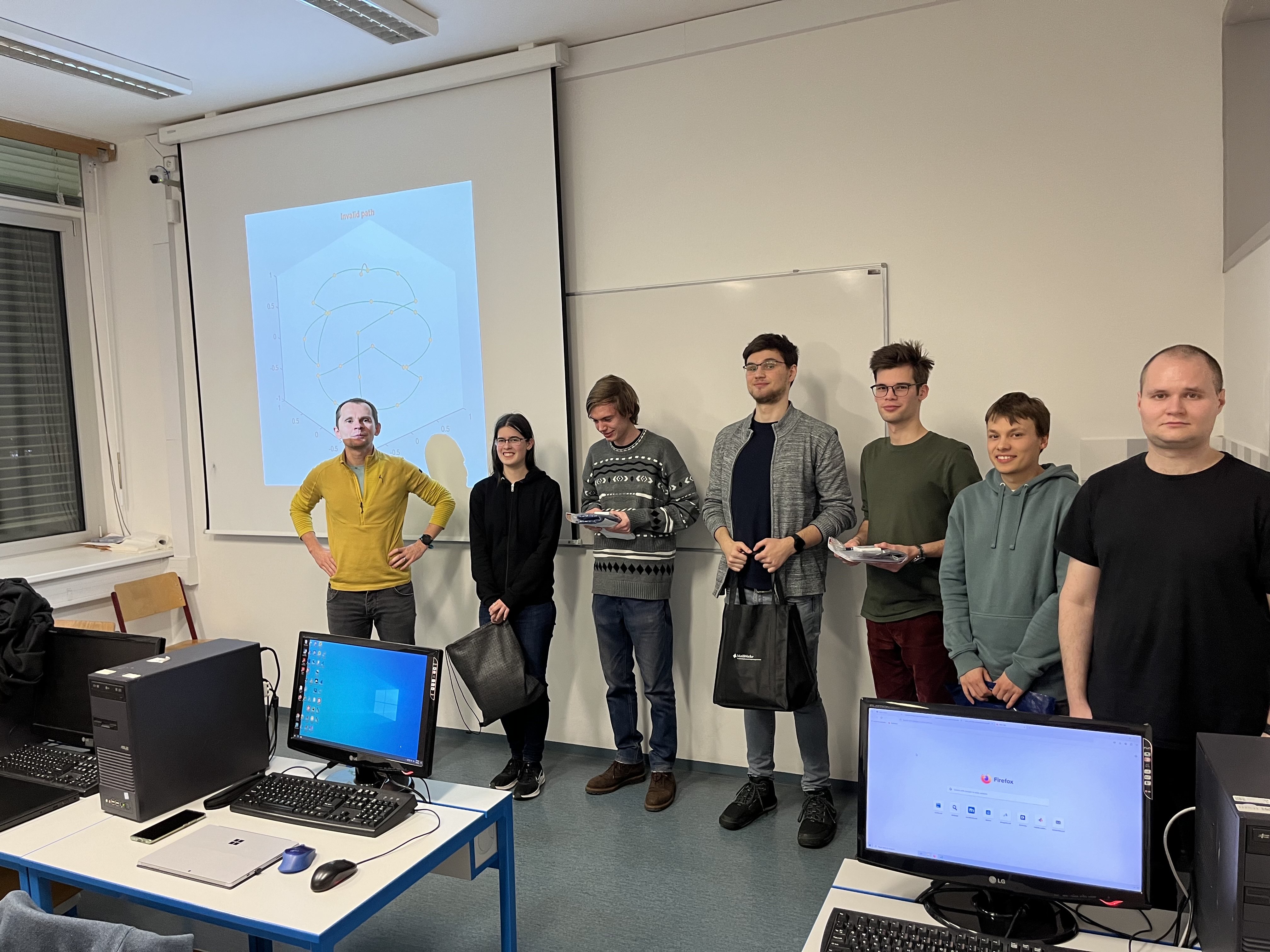 Twelve students selected the project and five of them successfully submitted it in a form suitable for testing. The task was to estimate the position of the robot as accurately as possible using Kalman filtering based on the supplied data from the sensors. The evaluation criterion in the competition was the mean square deviation of the predicted position from the actual position of the robot. The final order of the competitors was as follows (in the photo from the second to the fourth place from the left, on the far right the project leader Mr. Karásek):