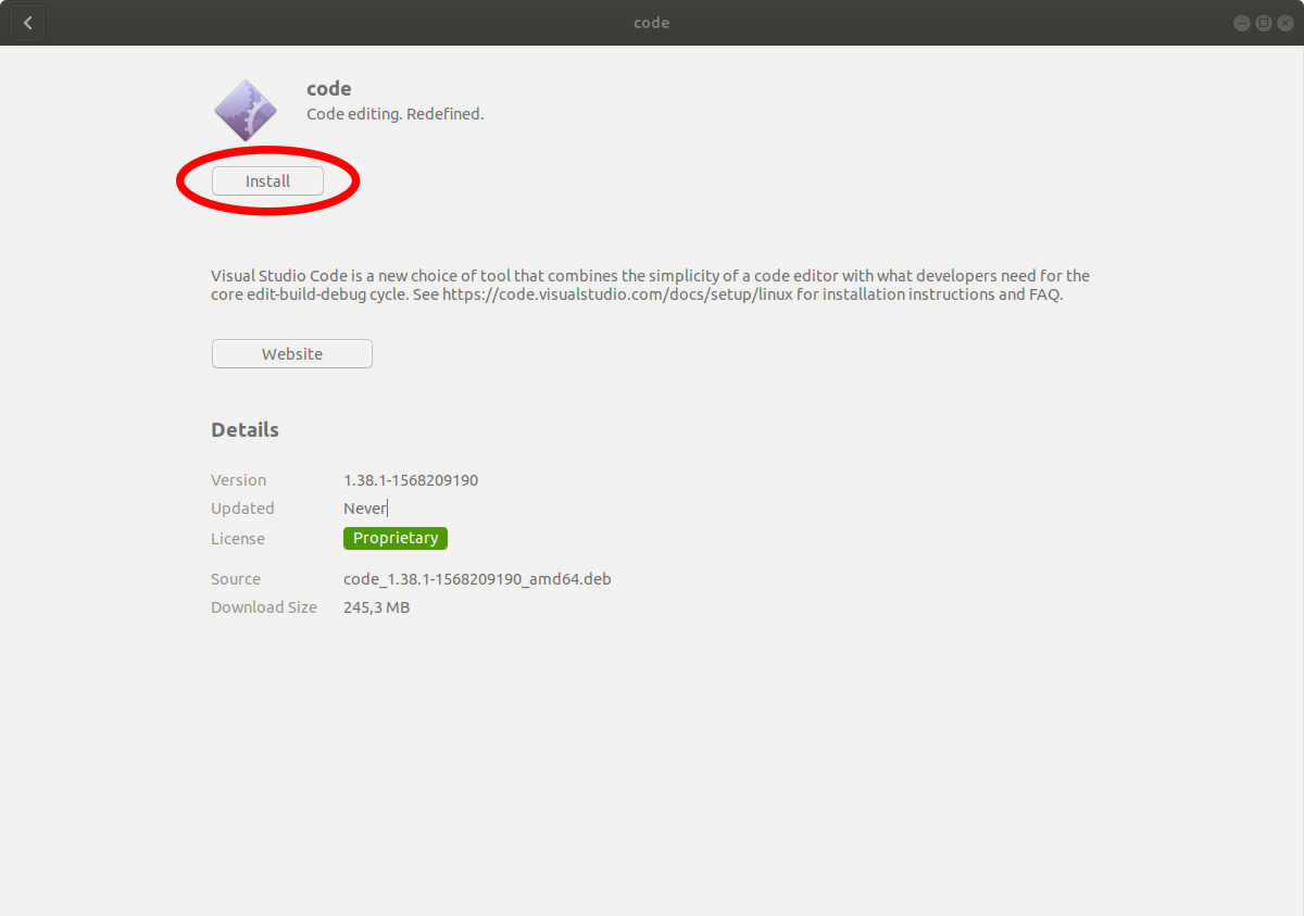 Ze stránek VS Code si stáhneme příslušný .deb balíček. Tento soubor funguje obdobně jako instalační soubory na Windows – otevřeme ho pomocí programu Software Installer a kliknutím na tlačítko Install nainstalujeme VS Code.