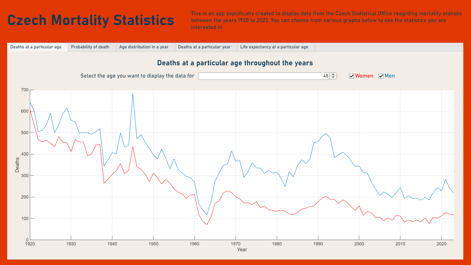Description: This app displays the Czech Mortality Statistics based on data from the Czech Statistical Office. Users can choose from five different graphs showing data from 1920 to 2023 in various ways. The graphs are particularly interesting when considered in a historical context, such as World War II, the Covid-19 Pandemic, and other significant events.