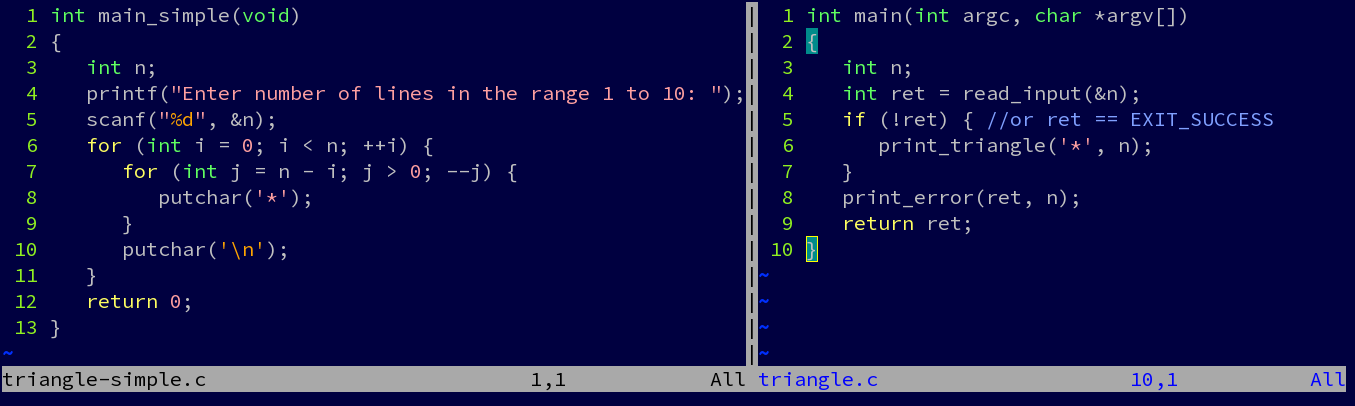 Při implementaci funkční program postupně rošiřujte o ošetření chybných vstupů, reportování chyb, případně dekompozici tisknutí trojúhelníku na tisknutí řádků, např. v následujících krocích.