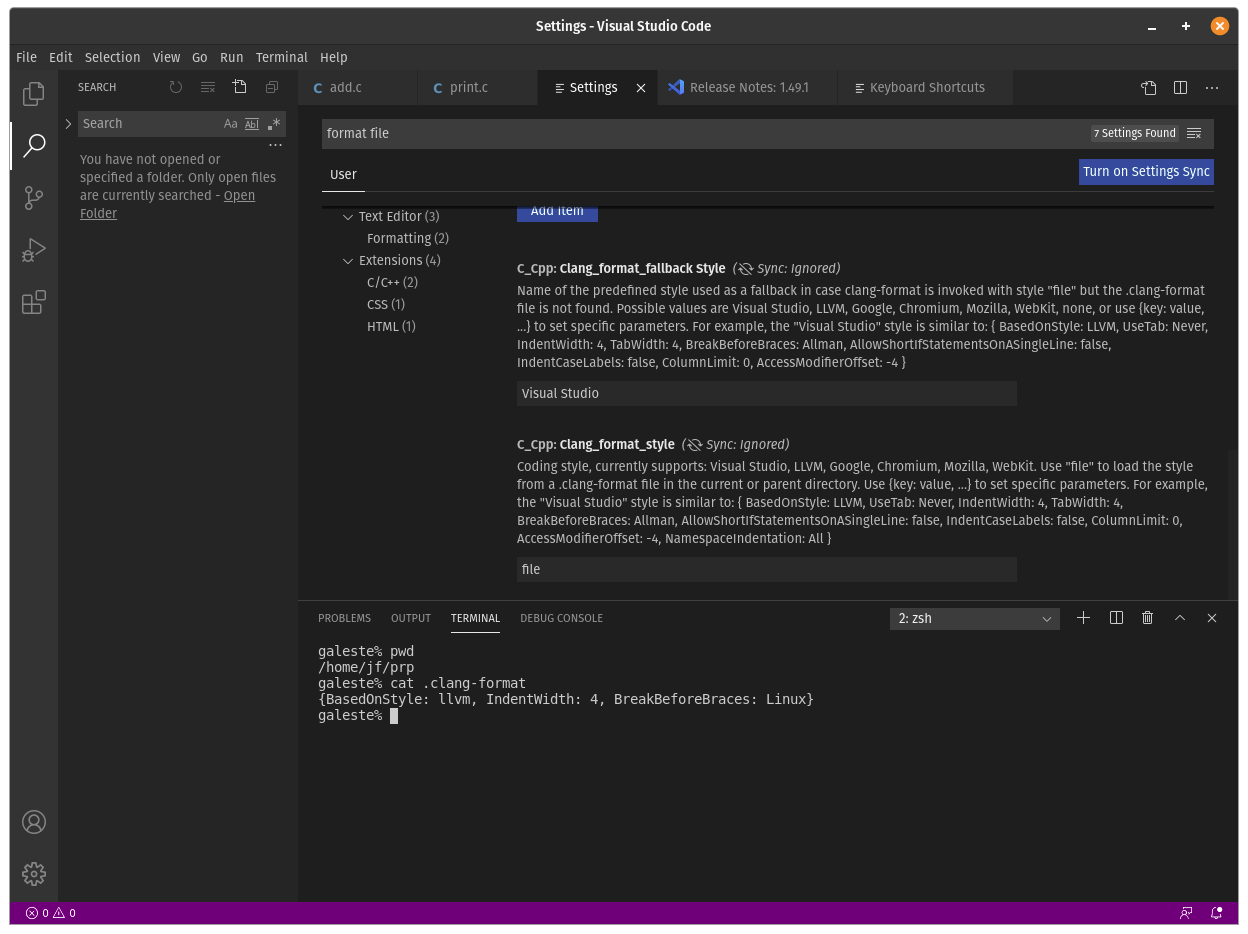 Prostřednictvím terminálu ve VS zjistíme jak pracovní adresář, tak můžeme vytvořit .clang-format, například doporučované nastavení