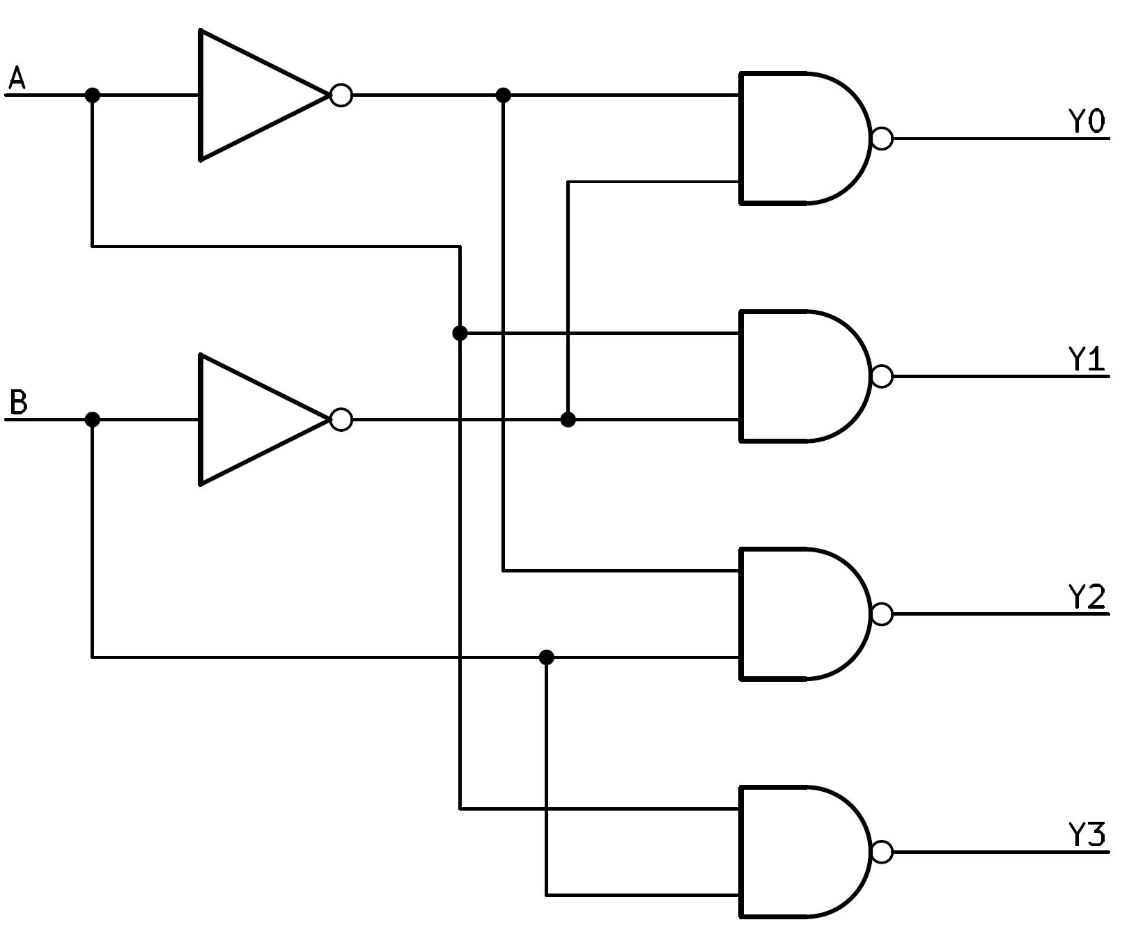 Dekodér 1 z N představuje obvod, který převede binární informaci na vstupu na aktivaci jedné brány na výstupu. Příkladem může být obvod 74HC139, který obsahuje dva dekodéry 1 ze 4 s invertovaným výstupem. Na následujícím obrázku je jedno z možných řešení dekodéru pomocí hradel. Dalším zástupcem může být obvod 74HC42, který je výběr 1 z 10 s negovanými výstupy.
