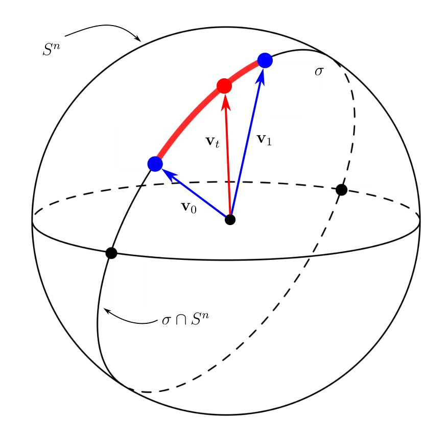 Another way to interpolate from $\mathbf{v}_0$ to $\mathbf{v}_1$ in $S^n$ such that $\mathbf{v}_0 \neq \pm \mathbf{v}_1$ while staying on $S^n$ is to define the interpolation path $\boldsymbol{\gamma}: [0,1] \rightarrow S^n$ by: