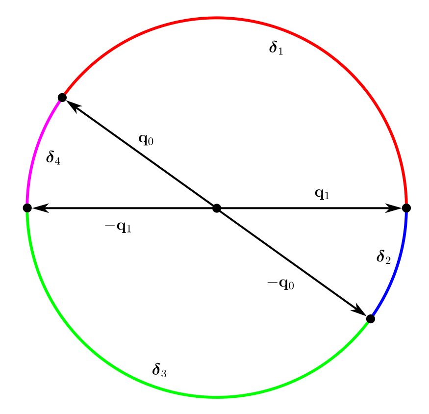 For example, $\boldsymbol{\delta}_2(t) = (\alpha_2(t), \boldsymbol{\beta}_2(t))$, where $\alpha_2$ interpolates from $-\theta_0$ to $\theta_1$ and $\boldsymbol{\beta}_2$ from $-\mathbf{v}_0$ to $\mathbf{v}_1$. Notice that the interpolation paths $\boldsymbol{\delta}_1$ and $\boldsymbol{\delta}_3$ generate equal paths in the space of rotation matrices $\mathrm{SO}(3)$. The same it is with $\boldsymbol{\delta}_2$ and $\boldsymbol{\delta}_4$. Hence we will further discuss only the paths $\boldsymbol{\delta}_1$ and $\boldsymbol{\delta}_2$. Another observation which we can make is that $\boldsymbol{\delta}_1$ and $\boldsymbol{\delta}_2$ generate disjoint trajectories in $\mathrm{SO}(3)$ (if we omit the starting and ending rotation). This is because on the red and blue arcs in $S^2$ there are no two axes which are equal up to sign. Hence, if we want to choose between $\boldsymbol{\delta}_1$ and $\boldsymbol{\delta}_2$, it is enough to specify a rotation matrix $\mathbf{R}_i$ somewhere in the middle of the trajectories that $\boldsymbol{\delta}_1$ and $\boldsymbol{\delta}_2$ generate in $\mathrm{SO}(3)$.