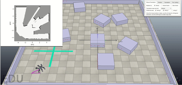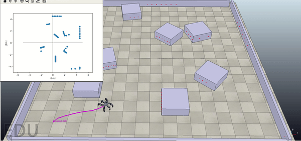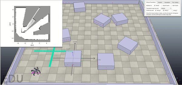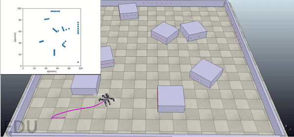 In class HexapodExplorer.py implement the fuse_laser_scan function. The purpose of the function is to fuse new data into the occupancy grid map as the robot traverses the environment. The laser scan measurements shall be fused to the grid using the Bayesian update described in Lab04 - Grid-based Path Planning. The input parameters of the function are: