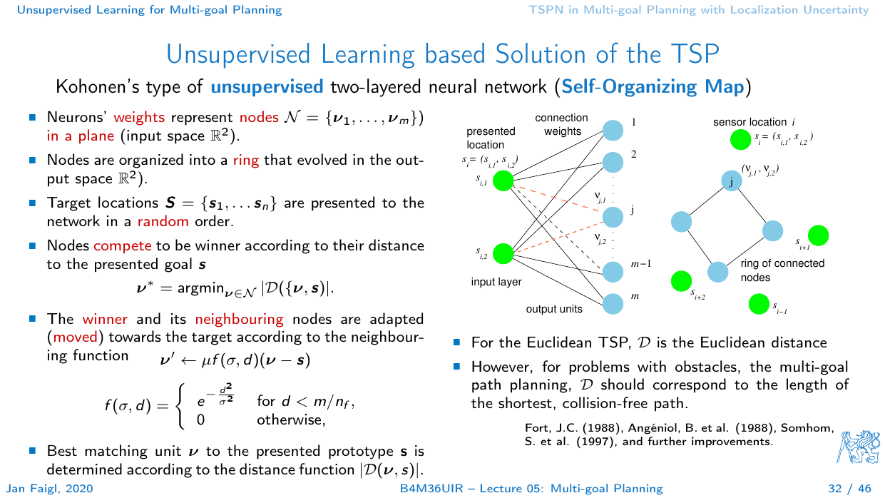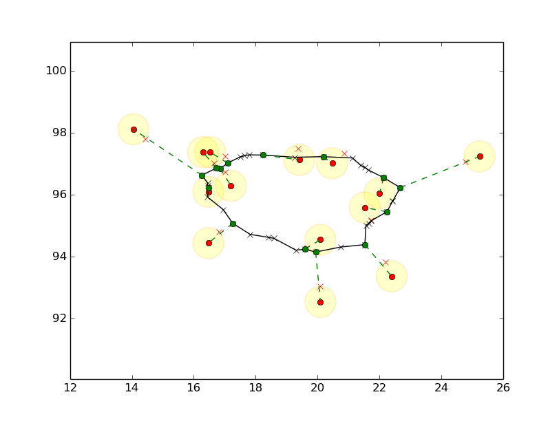 Utilize 'alternate goal' concept for solving TSP with neighborhoods (TSPN). In each epoch, the neurons are adapted towards the goals which inhibits them. But, in the TSPN, the neurons are adapted to the closes point in the specific goal neighborhood. Therefore, this concept enables to find shorter solutions, see the right image and the following GIF with SOM evolution.