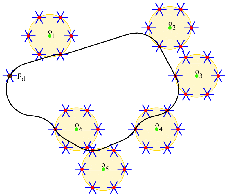 def plan_tour_noon_bean(goals, sensing_radius, turning_radius): """ Compute a DTSPN tour using the NoonBean approach. Parameters ---------- goals: list Vector3 list of the TSP goal coordinates (x, y, 0) sensing_radius: float neighborhood of TSP goals turning_radius: float turning radius for the Dubins vehicle model Returns ------- Path, path_length (float) tour as a list of robot configurations in SE3 densely sampled """