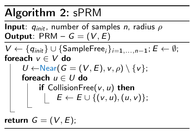 In class PRMPlanner.py implement the Simplified Probabilistic Roadmap (sPRM) randomized sampling-based path planning algorithm according to the description and pseudocode presented in the Lecture 09.