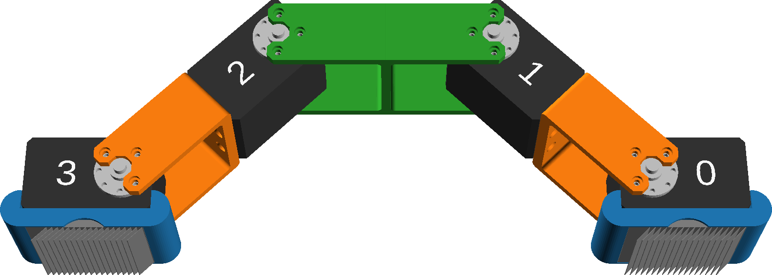 The robot frame consists of 4 servomotors, referred to as servo-0 to servo-3 (numbering starts from the robot front), two stiff bumpers called bumper-front and bumper-back and depicted in blue, two contact scales called scales-front and scales-back and depicted in grey, two short brackets called bracket-front and bracket-back and depicted in yellow, and finally the double-sided bracket called bracket-middle depicted in green.