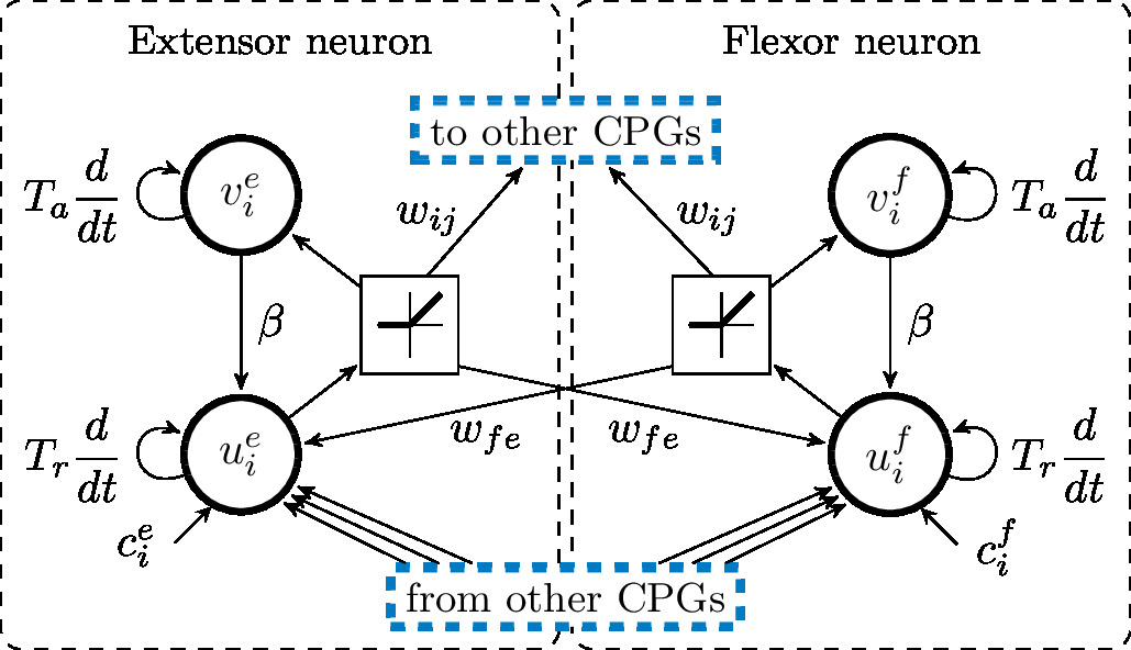 Central Pattern Generator (CPG) is a biologically inspired neural network that produce rhythmic patterned outputs 1). CPGs are composed from individual neurons connected by mutual inhibition. The most used model and structure of the CPG is a Matsuoka oscillator 2). The main problem is parameter tweaking of individual connections to achieve limit cycles in the neural network 3)